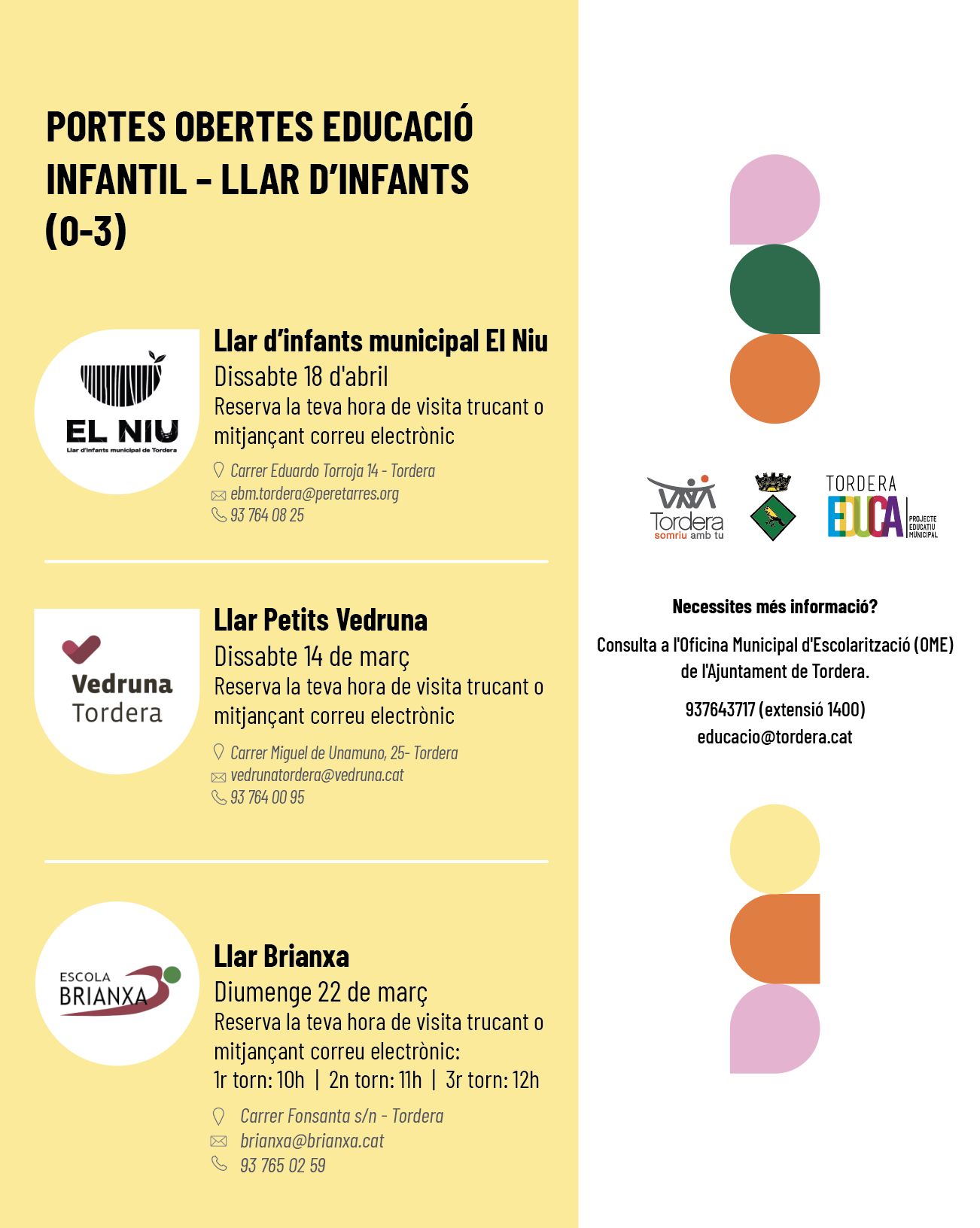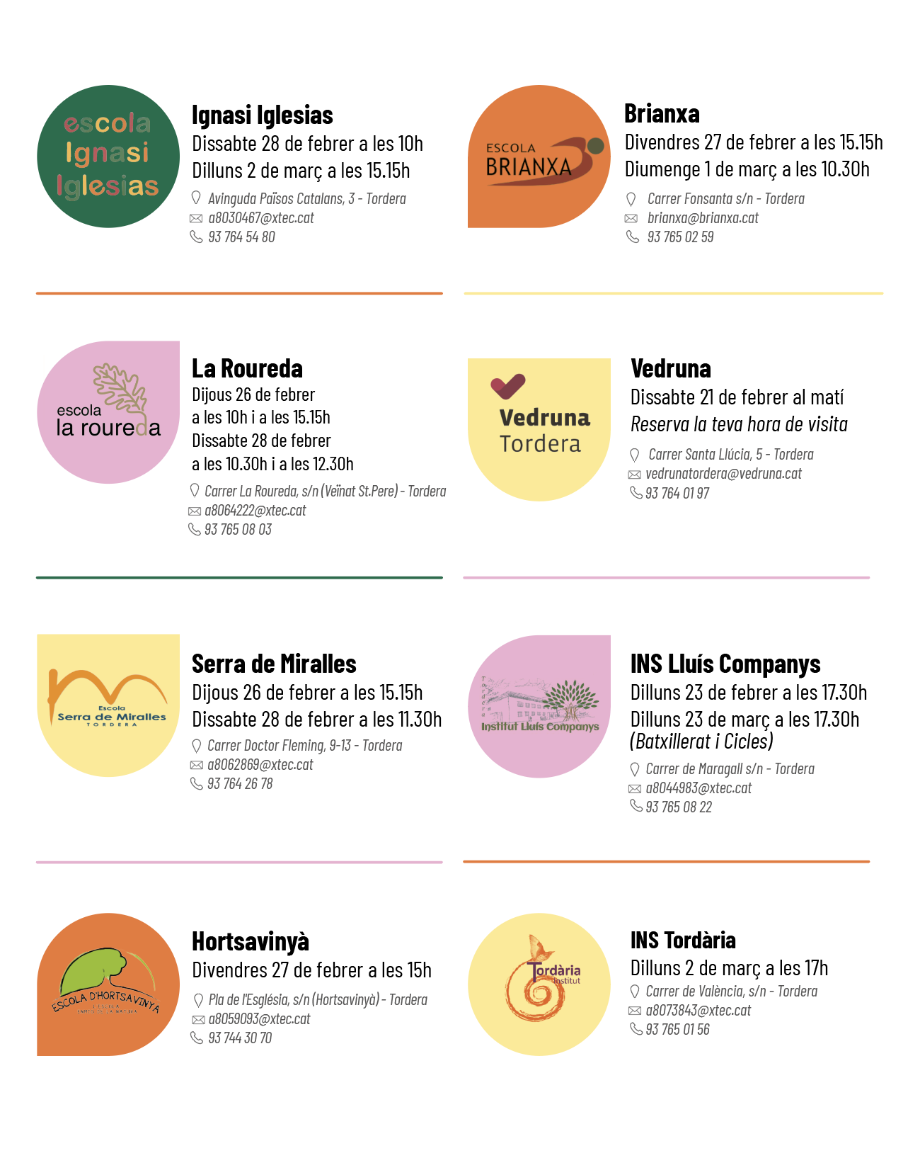 Els centres educatius d'educació, llar d'infants, infantil, primària i secundària de Tordera han organitzat jornades de portes obertes de cara al curs 2026-2027 per aquests propers mesos. En aquesta notícia trobareu en format d'imatges tota la informació: