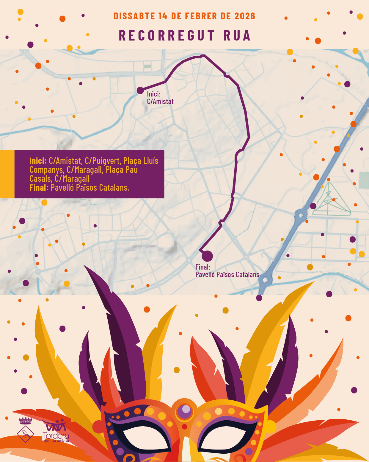 Tot plegat acabarà el dissabte 14 de febrer amb la gran rua que sortirà des del Carrer Amistat (davant el CEM Tordera), seguirà per C/Puigvert, Plaça Lluís Companys, C/Maragall, Plaça Pau Casals, C/Maragall de nou fins el Pavelló Països Catalans.