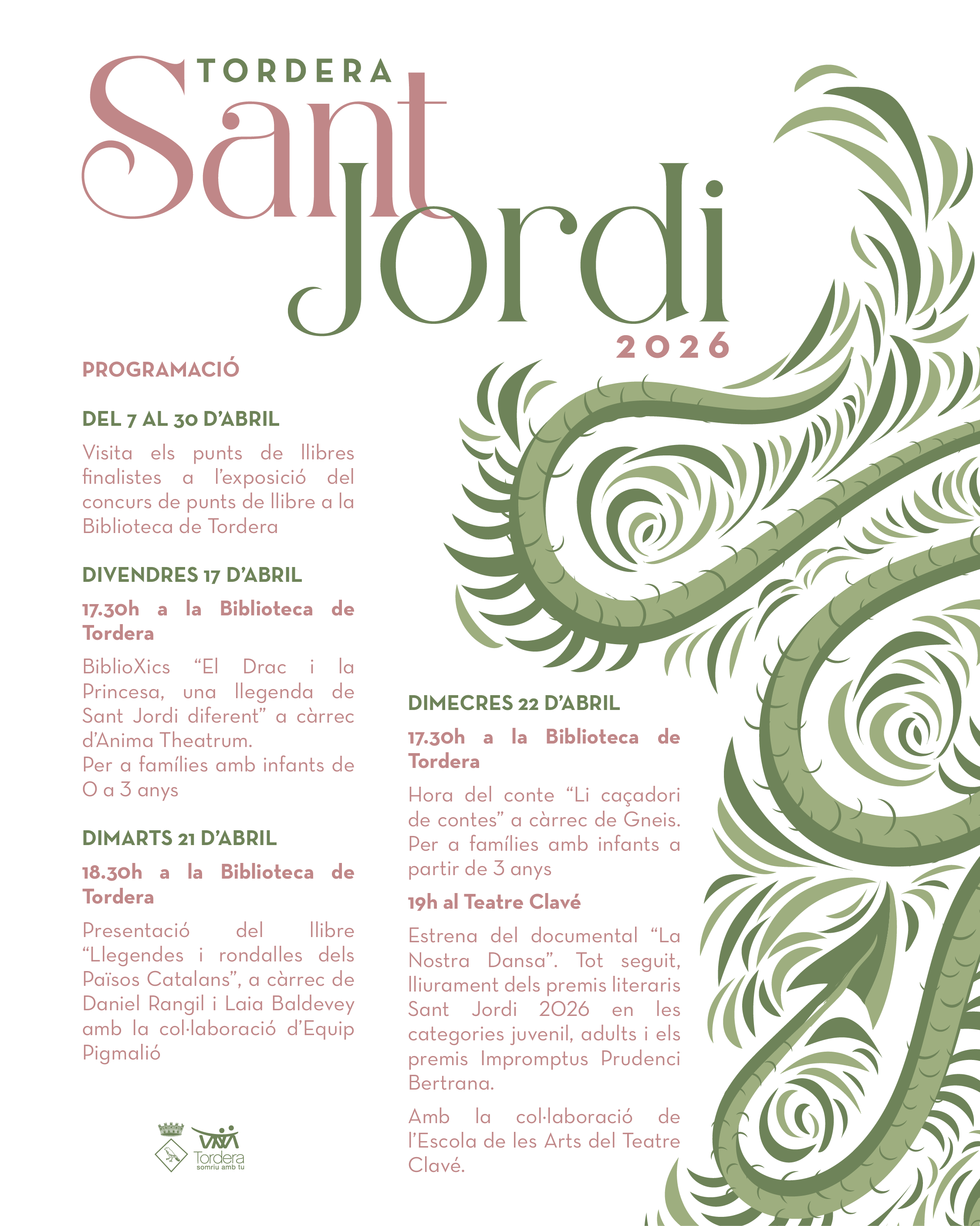 La Diada de Sant Jordi es viurà a Tordera durant diferents dies i múltiples propostes. L'Ajuntament de Tordera organitza una programació d’activitats per al públic familiar, infantil i adult.