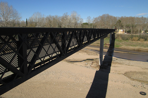 Aquest pont era una infraestructura de 183 metres de llarg per 1,60 metres d’ample, sostinguda per 10 pilars de ferro, clavats a quatre metres de profunditat i amb un sòl de fusta. L’element fou finançat íntegrament pels veïns de la vila. A l’octubre del 1895 s’adjudicà la construcció del pont de Ferro a La Maquinista Terrestre y Marítima i el 13 de gener del 1896 s’exposaren els plànols del pont a la plaça de l’Església. Al juliol del mateix any arribaren tres vagons amb les peces destinades al muntatge del pont, de manera que se n’inicià la construcció.
