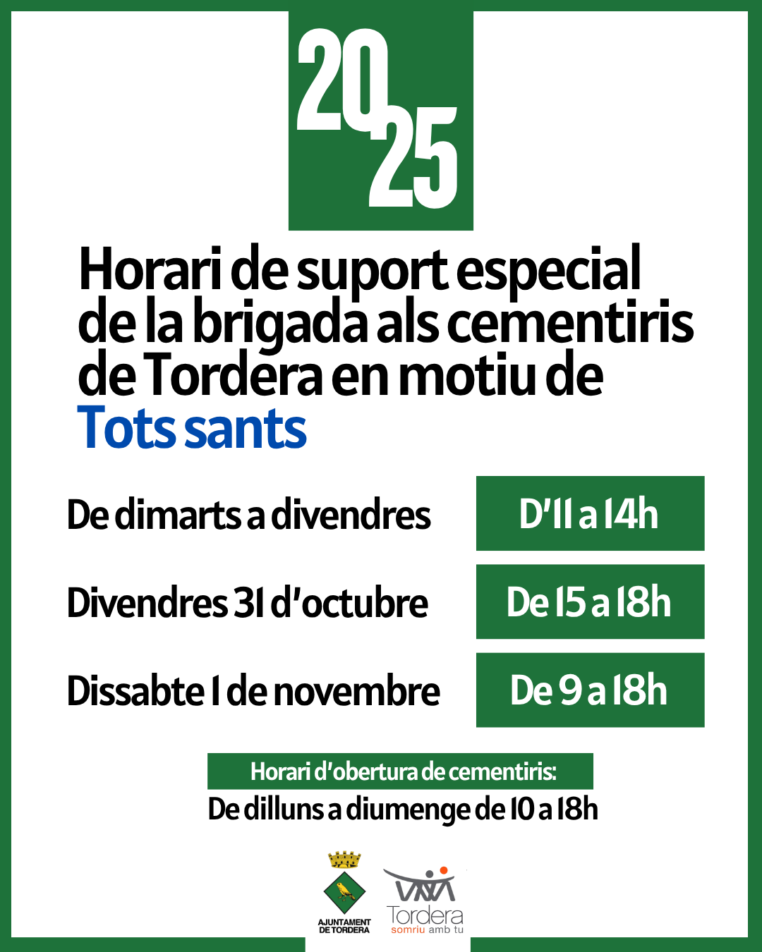 L'horari d'obertura serà des de les 10h del matí fins a les 18h. Centenars de torderencs/ques aniran als cementiris municipals amb motiu de la diada de Tots Sants (1 de novembre).