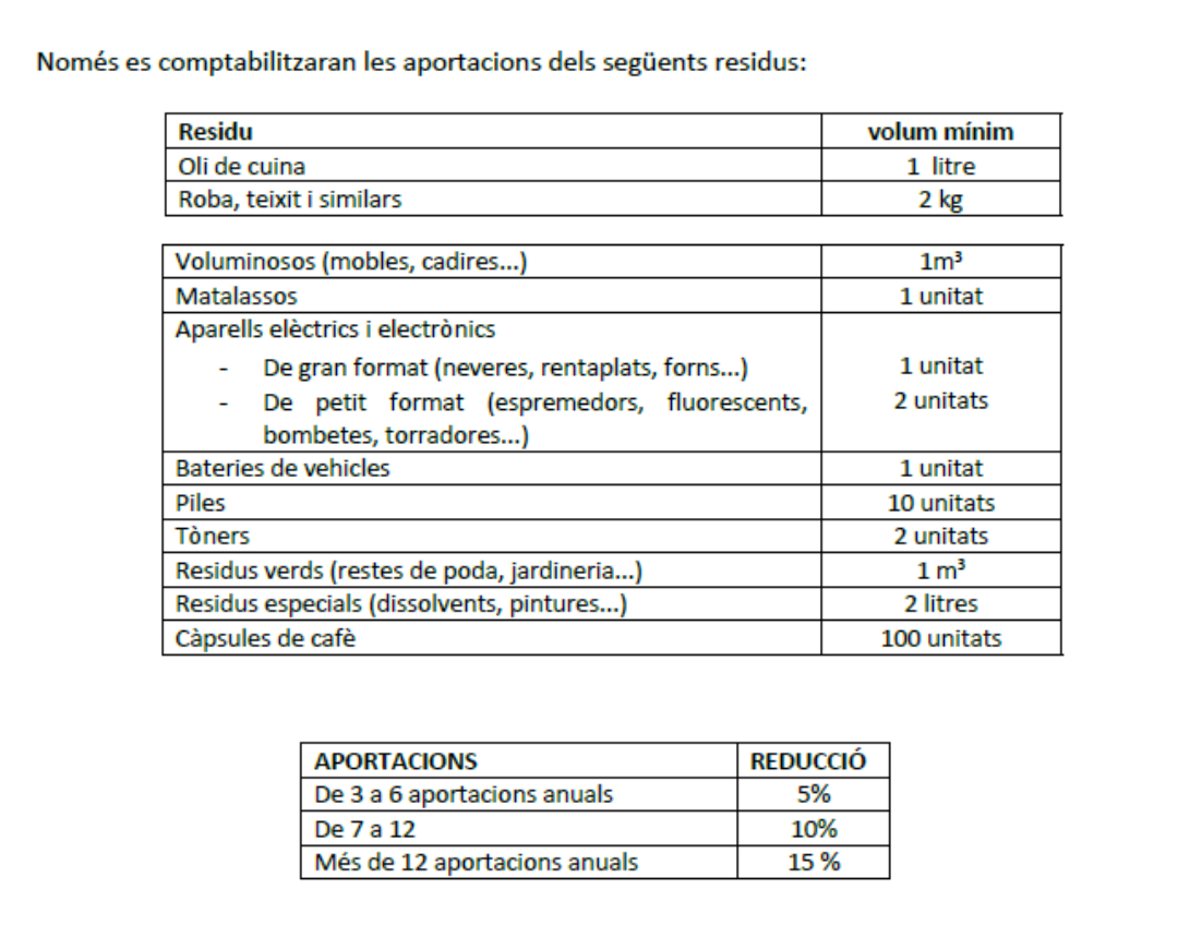 Per la bonificació de la taxa per ús de la deixalleria, es tindran en compte les aportacions fetes des de l’1 de gener i fins al 31 de desembre de l’any anterior, computades per dies d’entrada a la deixalleria i no per tipologia de residu.