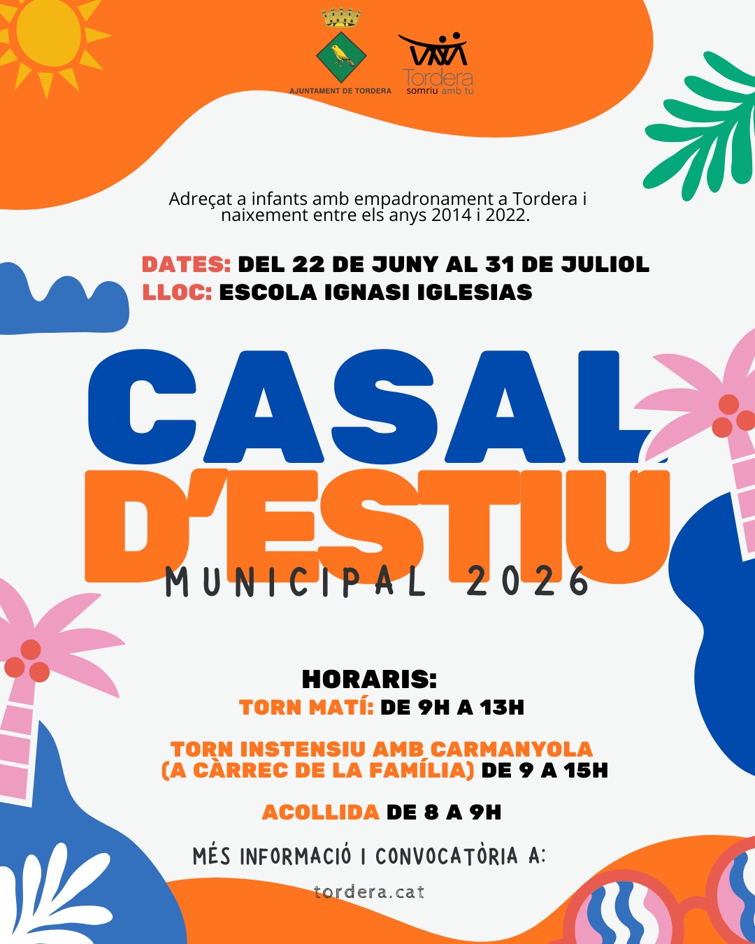 El Casal d'Estiu municipal és un projecte ja consolidat per part de l'Ajuntament de Tordera i que s’impulsa del 22 de juny al 31 de juliol. Promou l'educació integral dels infants a través del lleure.