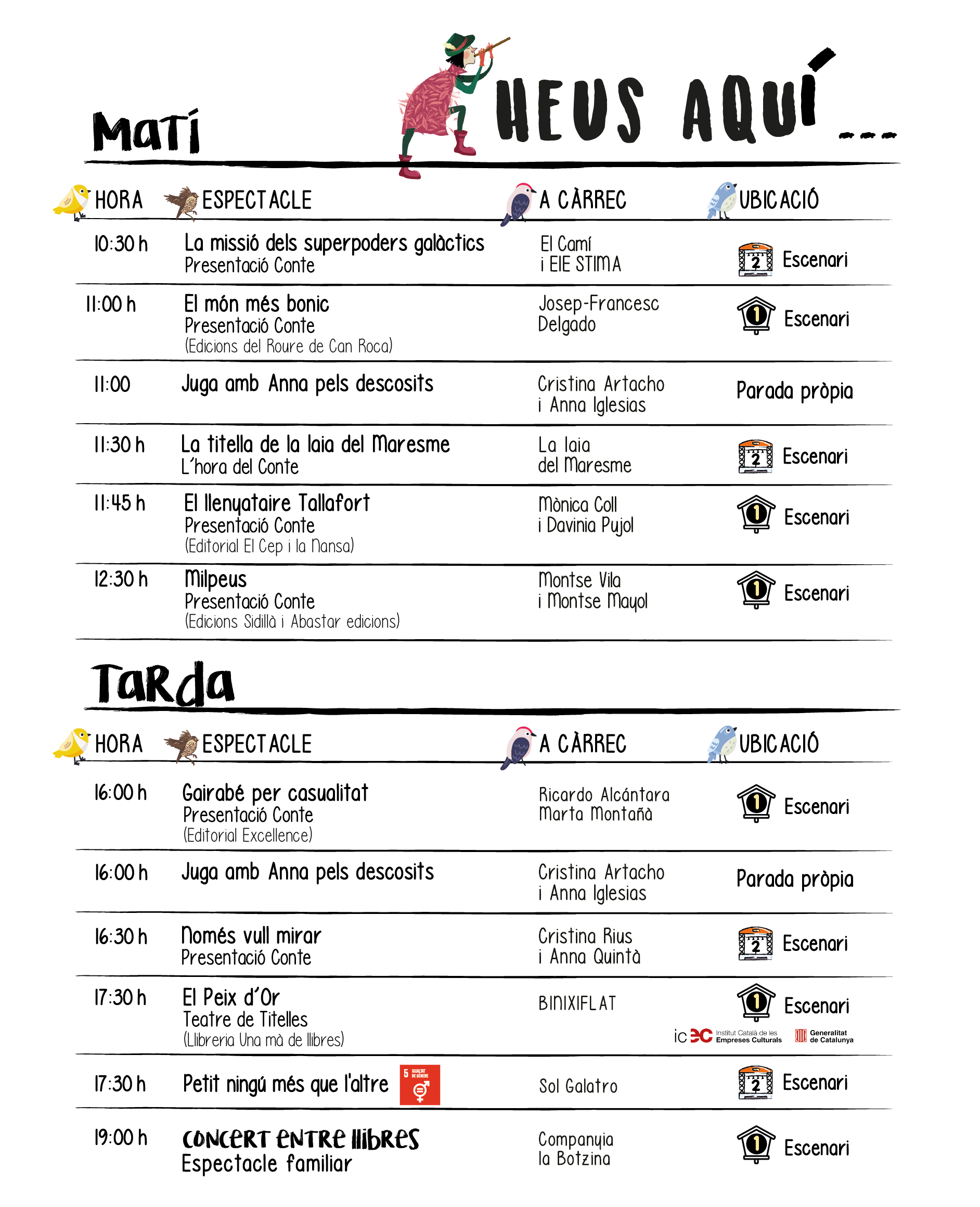 Les editorials i llibreries que es podran trobar són: Una mà de llibres, Garbuix Books, La topera, Editorial el Pirata, Artèria, el Cep i la Nansa, Abastar-Eines d'aprenentage, Edicions del Roure D Can Roca, Excellence Editorial, La Producción Creaciones, Llibreria infantil Gibert i, entre d'altres, Zahorí Books.