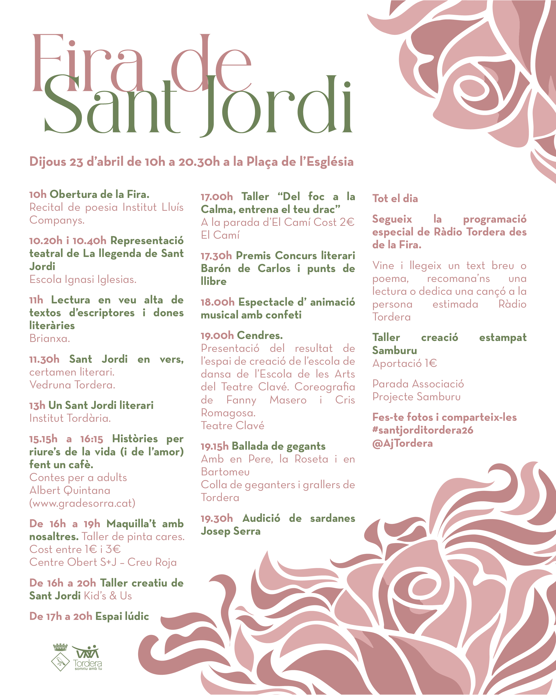 La Diada de Sant Jordi es viurà a Tordera durant diferents dies i múltiples propostes. L'Ajuntament de Tordera organitza una programació d’activitats per al públic familiar, infantil i adult.